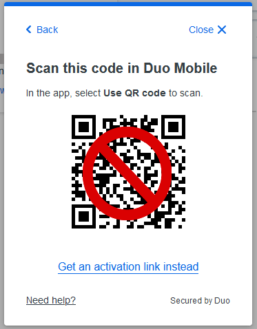 If you have trouble with the QR code, click the activation link instead. This will take you to a new window where you can enter an email address to which the activation code should be sent. Access the email from the same device where you have Duo Mobile installed.